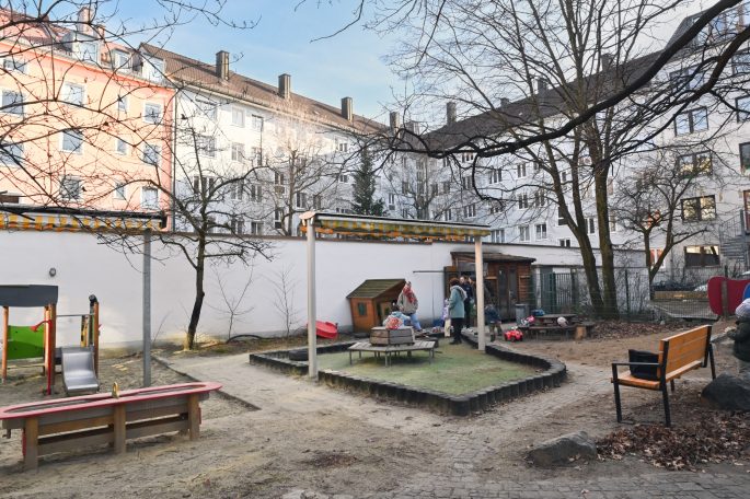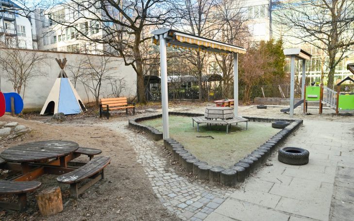 Besonders beliebt zu jeder Jahreszeit: der kindergarteneigene Spielplatz im grünen Innenhof. Auf Rutsche, Kletterhügel und Holzpferd können die Kinder sich austoben. Auch Tipi, Sandkasten und Spielhaus werden gerne genutzt. Im Sommer ist für ausreichend Schatten gesorgt, sodass die Brotzeit draußen stattfindet. Bunt bepflanzte Beete grenzen den Garten ein und machen ihn zu einem Ort, an dem Kinder und Erzieher gerne Zeit miteinander verbringen.