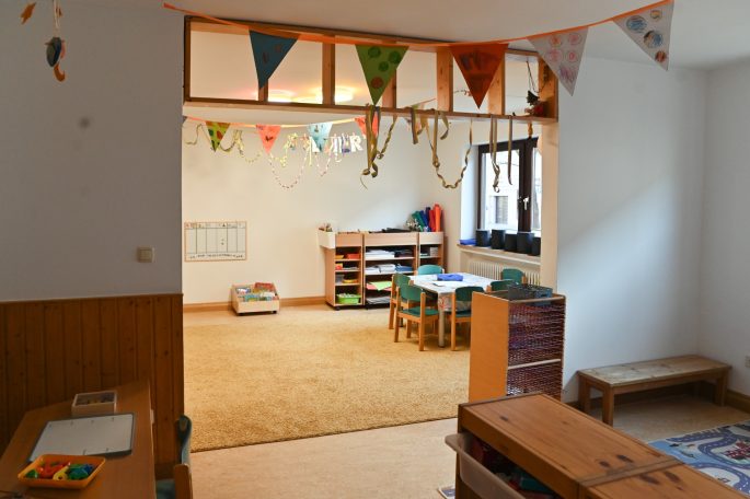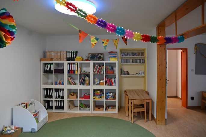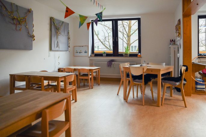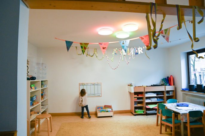 Der Kindergarten befindet sich in einem ruhig gelegenen Wohnhaus in der Deisenhofener Straße. Im unteren Stockwerk gibt es Garderoben, das Büro, einen Entdeckungsraum sowie ein weiteres großes Zimmer, in dem im Morgenkreis gemeinsam in den Tag gestartet wird. Anschließend entscheiden die Kinder selbstbestimmt, wo sie spielen – ob unten, oben oder draußen.